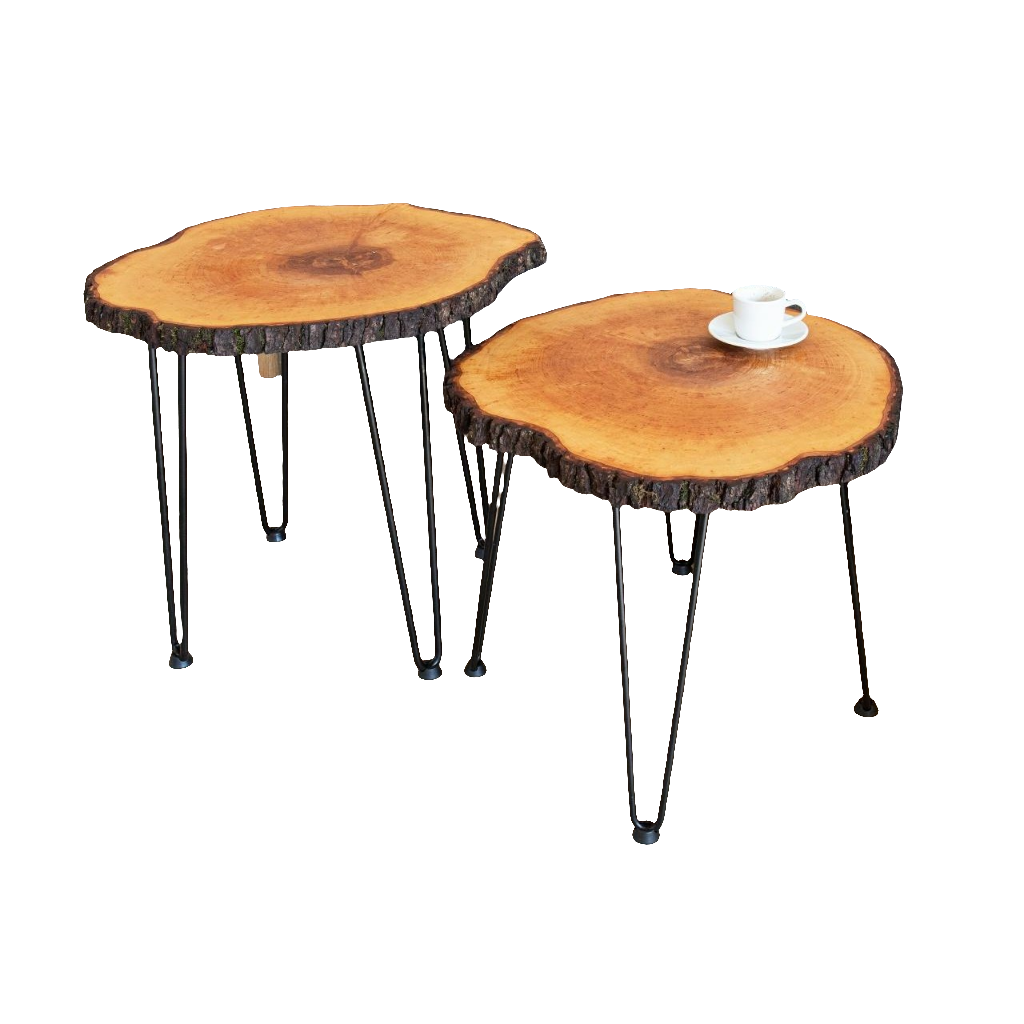 Tischplatte Ø 51-55 cm x 3 cm Erle Baumscheibe mit Rinde - die Rinde bleibt auch auf Dauer haften. Die Scheibe wurde extrem langsam getrocknet so das keine großen Risse entstehen können. Die Beine aus in Haarnadeloptik sind aus robusten Metall und werden mit Kunststoff Füßen und Schrauben geliefert. Beine müssen vom Kunden montiert werden.