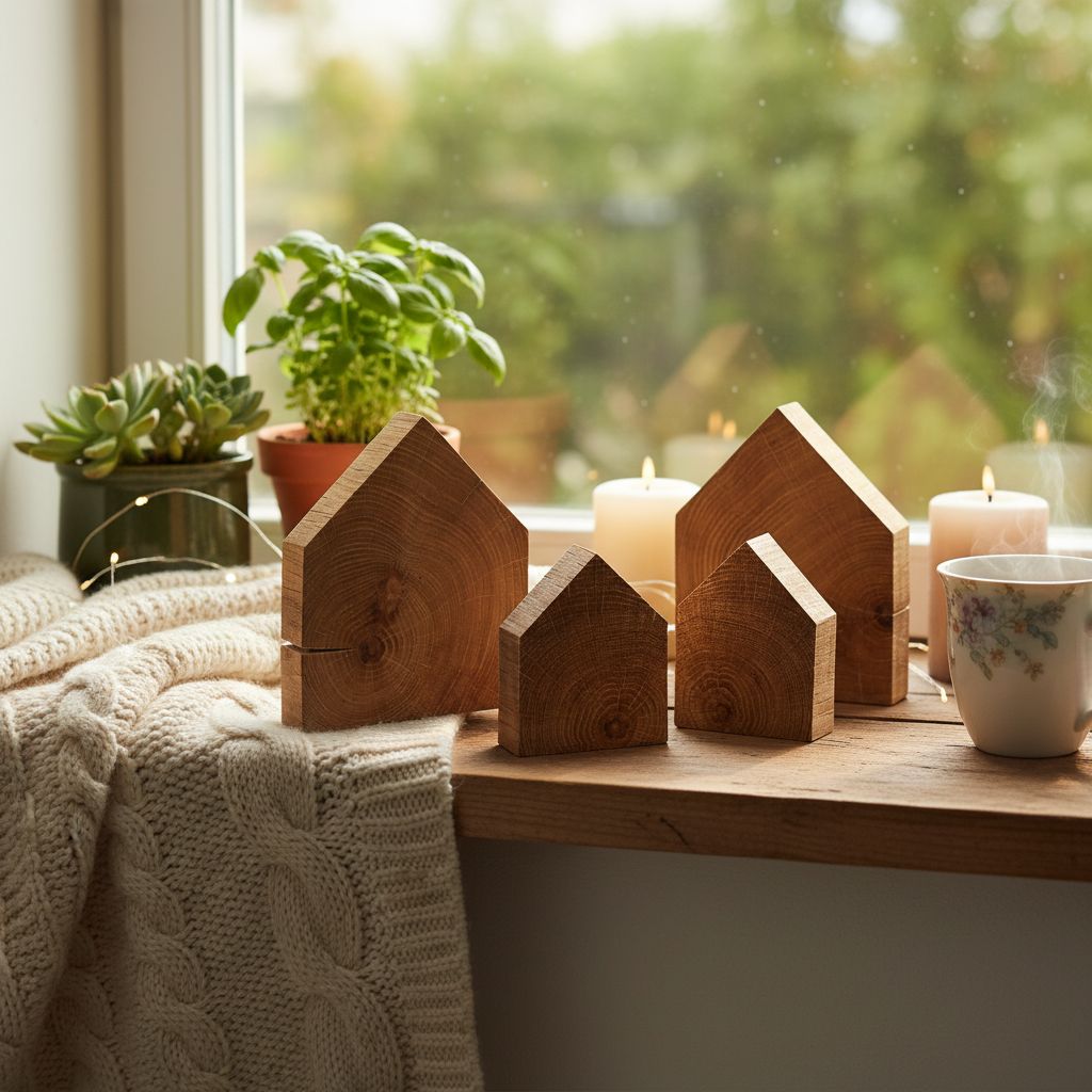 Die Oberfläche ist geölt, wodurch die Holzstruktur noch edler wirkt und gleichzeitig geschützt wird. Ob als Deko auf der Fensterbank, im Regal, als Tischdeko oder als liebevolles Geschenk – die Häuschen passen in jedes Zuhause und jeden Einrichtungsstil.