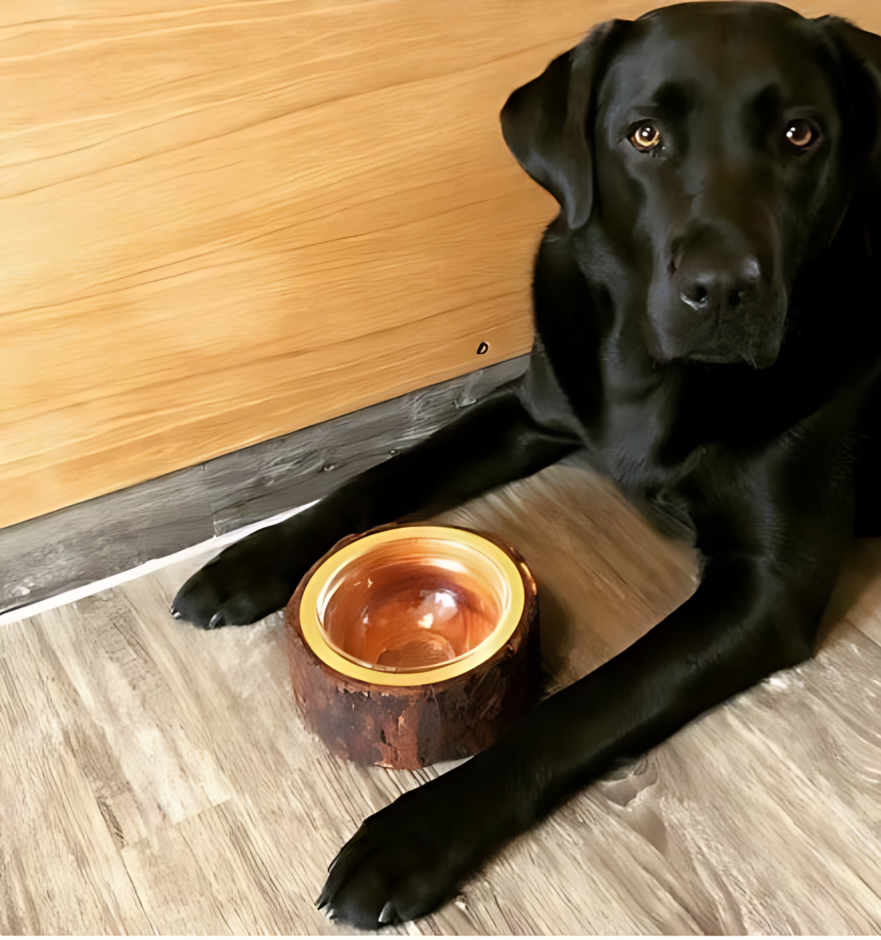 Der handgefertigter Futternapf kommt mit einer Lasergravur in Form einer Tatze oder Pfote. Der Futterteller ist aus einer natürlichen Baumscheibe gefertigt und besitzt eine eingelassenen Glasschale für das Futter oder Wasser.