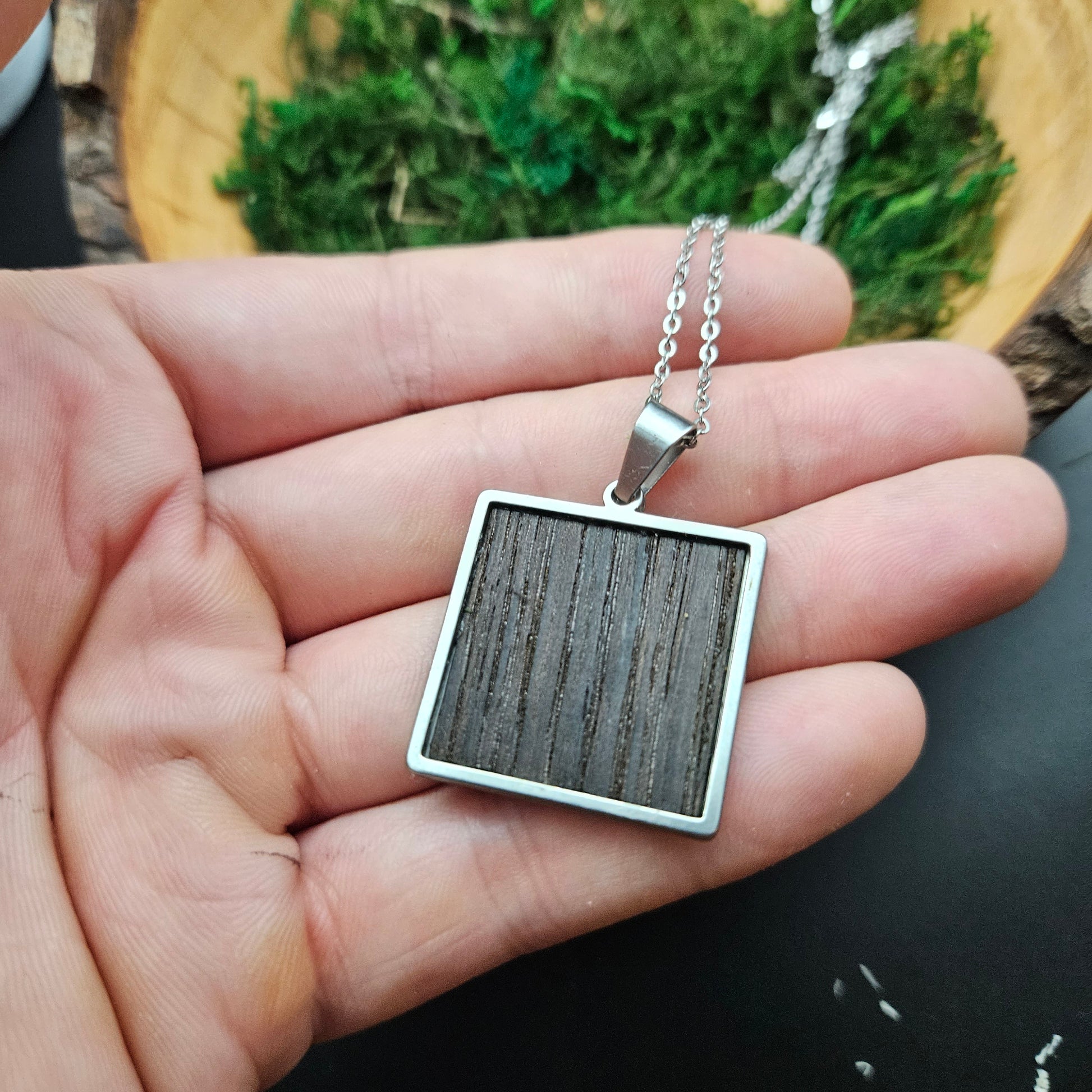 Edelstahlhalskette mit Edelstahel und Räuchereiche. Fassung in 2×2cm und 4×4cm