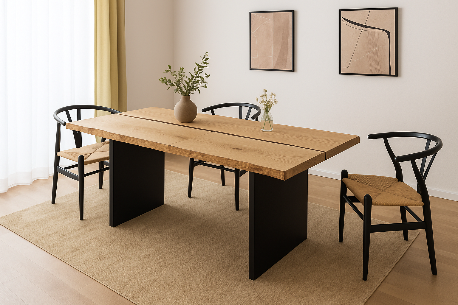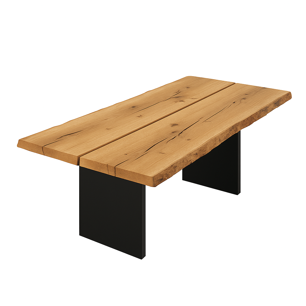 Unser einzigartiger Esstisch kombiniert zwei massive Eichenbohlen mit charakterstarker Maserung und einem modernen Wangengestell aus Stahl. Die natürliche Holzoberfläche und die klaren Linien der Tischwangen schaffen ein harmonisches Zusammenspiel aus Handwerkskunst und zeitloser Eleganz – perfekt als Esstisch, Schreibtisch oder Konferenztisch.