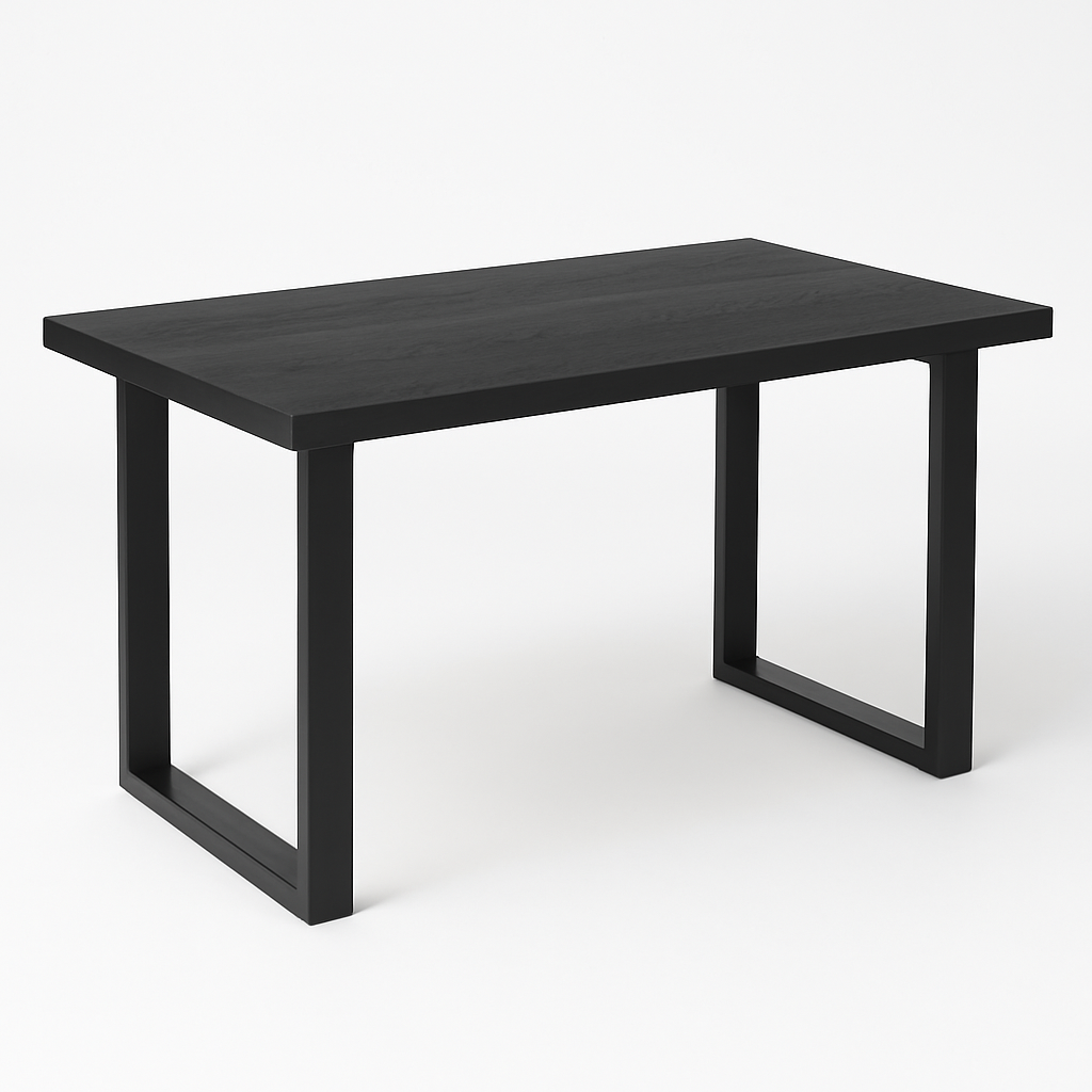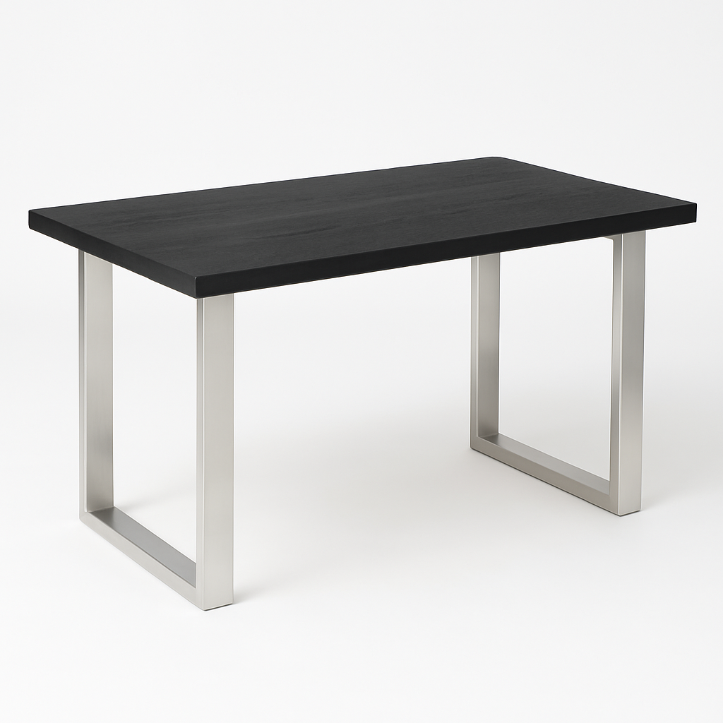 Maßgefertigter Tisch mit schwarzen Stahlgestell und schwarzer Tischplatte aus massiver gebeizten Eiche – ( auch mit Edelstahlgestell und/oder heller Eiche möglich!)