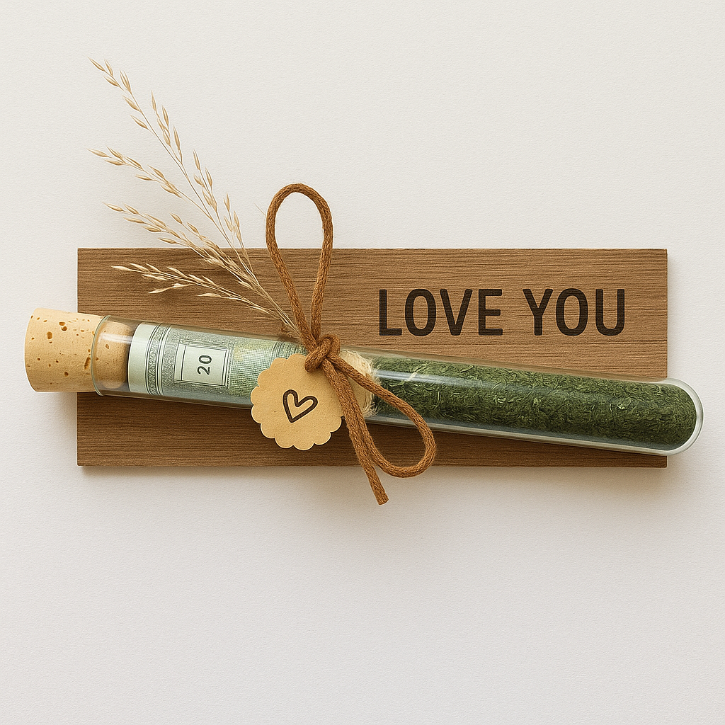 Unsere handgemachte Reagenzglas-Geschenkverpackung macht aus Geld oder Gutscheinen ein echtes Highlight.
