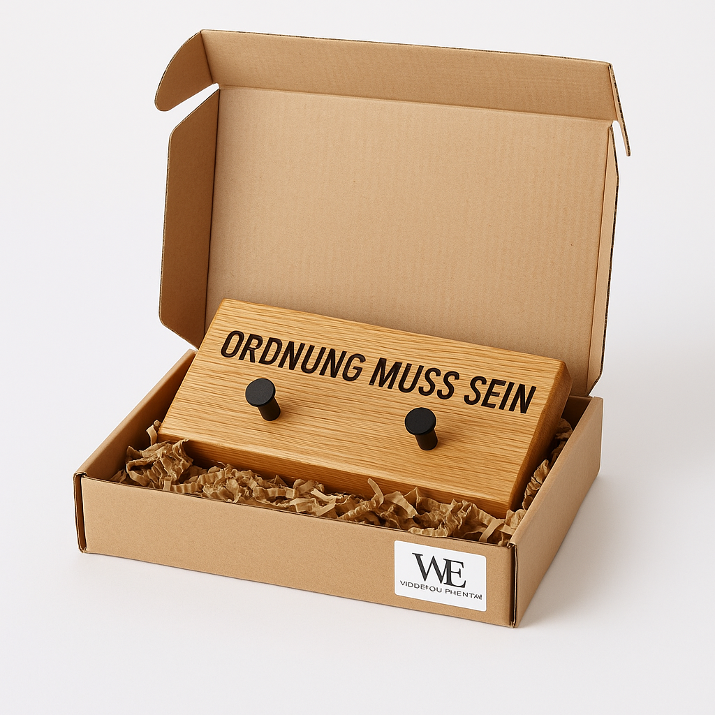 Unser Schlüsselbrett aus echter Eiche verbindet minimalistisches Design mit praktischer Funktionalität. Die Gravur „Ordnung muss sein“ sorgt nicht nur für ein Schmunzeln, sondern macht dieses Wohnaccessoire auch zu einem echten Blickfang in deinem Flur oder deiner Küche.
