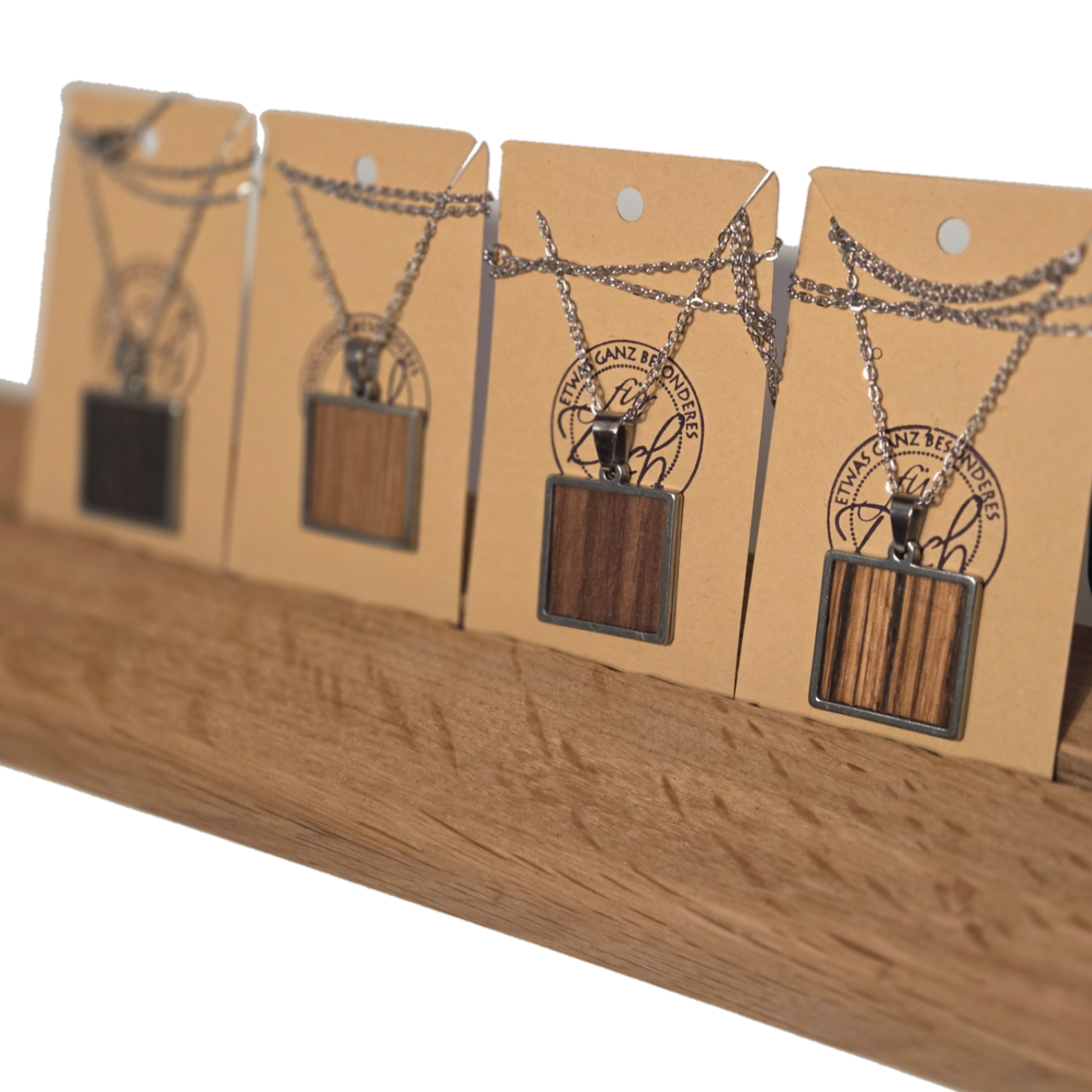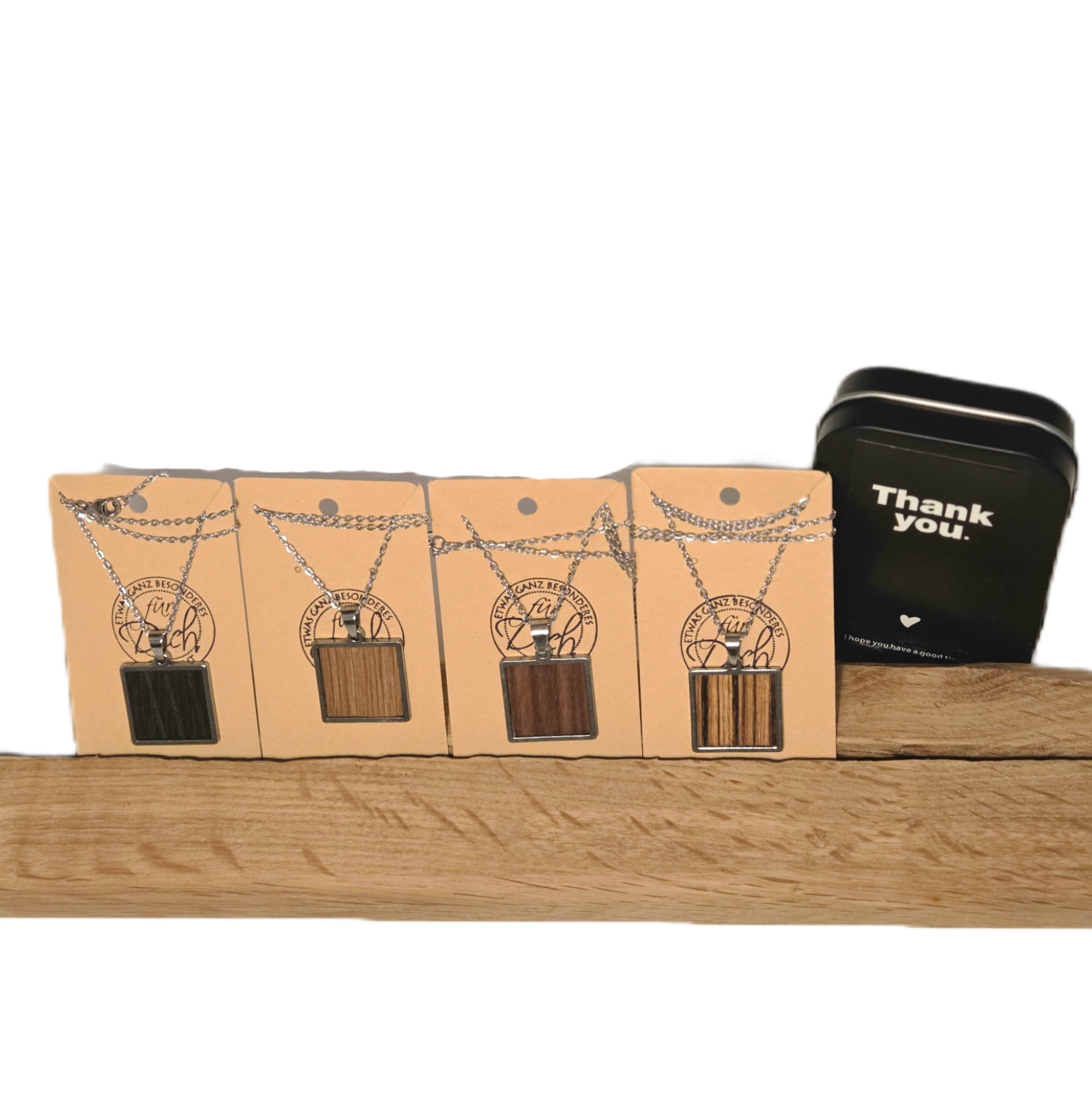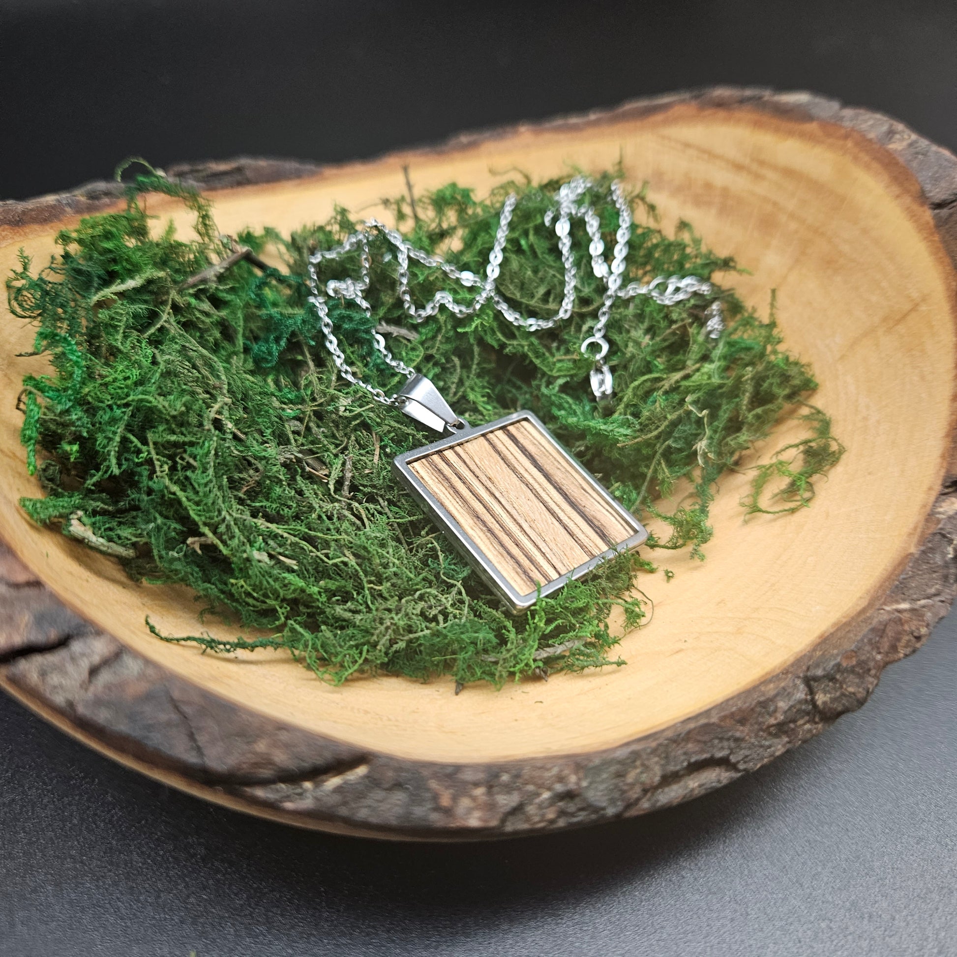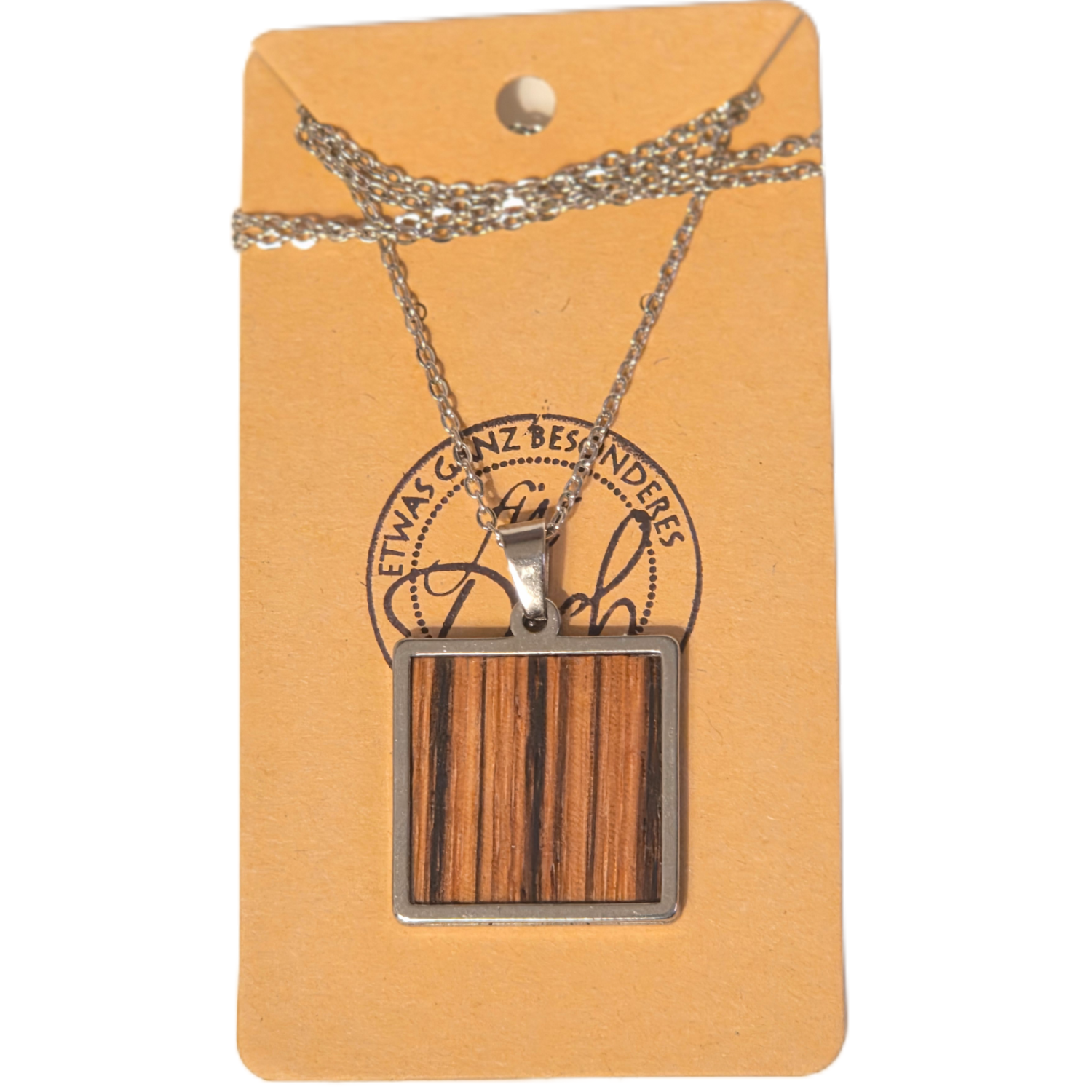 Edelstahlhalskette mit Edelstahel und Zebrano Holz. Fassung in 2×2cm und 4×4cm