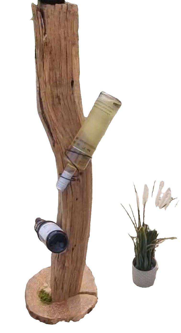 Besonders das gespaltene und leicht verdrehte massive Eichenholz macht diesen Weinständer zu einem echten Blickfänger.